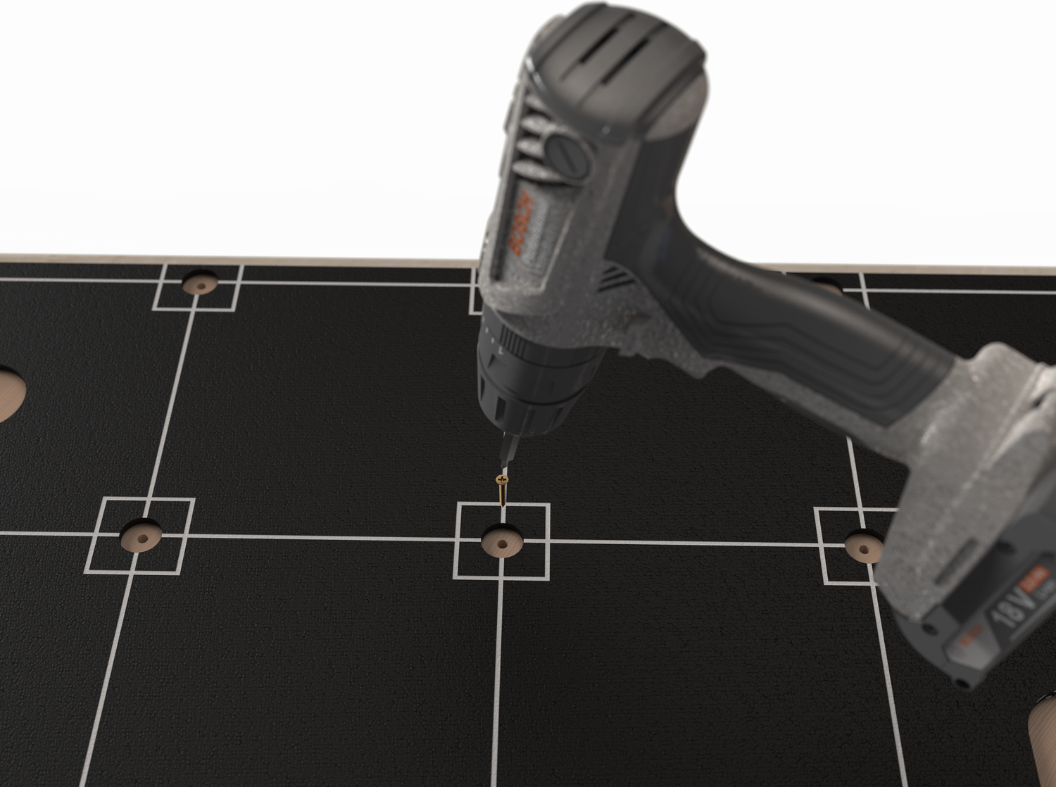 Driving screws through the perforations result in a consistent 6" interval across the entirety of the mat. Opt for either using a tradition screw gun or a colated screw gun, , adjusting the